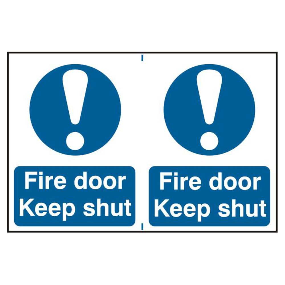 Mandatory fire door sign which includes a blue circle containing a white image denoting that a specific course of action must be taken. 2 or 6 signs per sheet.