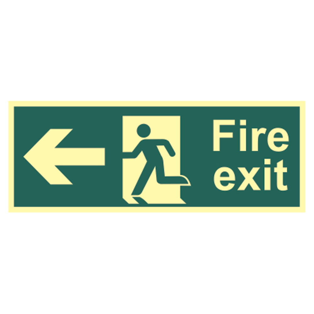 Fire exit and evacuation sign in photo luminescent finish. In the event of a fire or emergency signs can often be impaired by poor lighting, smoke or even lack of power. The signs remain highly visible even in complete darkness.