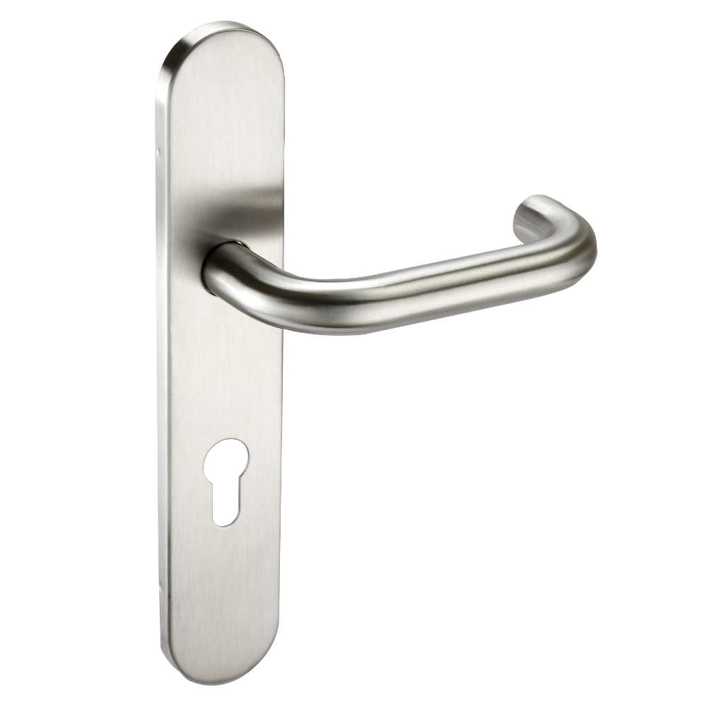 Radius plate DDA approved sprung lever door furniture from Asec, available in a Satin Stainless Steel finish to suit different lock types