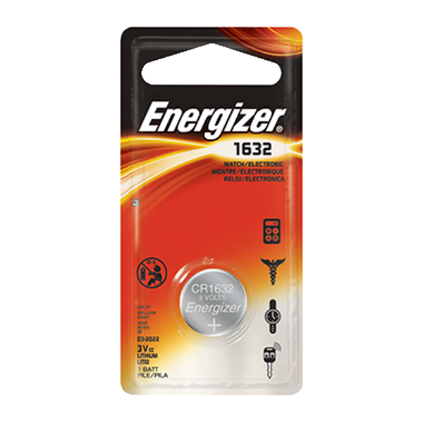This blister packed CR1632 3V lithium coin cell from Energizer replaces the BR1632 and DL1632 and is commonly used in calculators & watches.