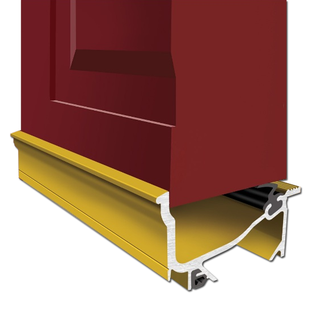 An under door sill for inward opening doors with 25mm bottom clearance giving exceptional protection from the elements, dust and noise.