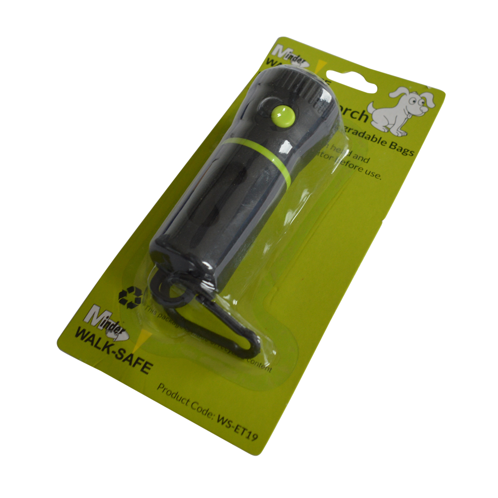 The MINDER Walk-Safe Eco Dog Torch is a handy, compact size torch supplied complete with 15 biodegradable poo bags, making it the ideal environmentally friendly product for dog walkers during darker mornings and nights.